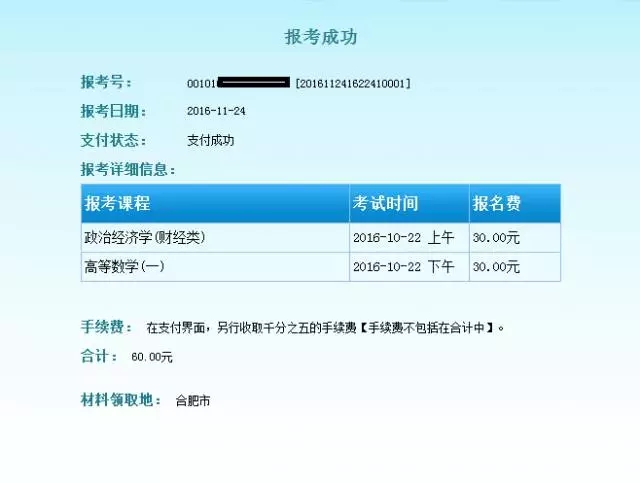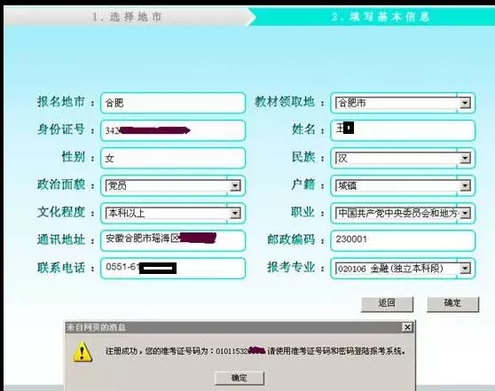 填寫個(gè)人信息后點(diǎn)擊確定,系統(tǒng)提示注冊成功,并給出準(zhǔn)考證號碼