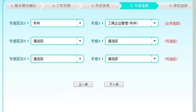 這一步默認(rèn)為首次報(bào)考專業(yè),可以修改,可以多選。考生所有報(bào)考的課程在那個(gè)專業(yè),那么對應(yīng)的專業(yè)在此處必須選擇,最多可以選擇3個(gè)。如有替代課程的,把替代課程所在的專業(yè)選擇了,下一步就能看到相應(yīng)選擇專業(yè)中的開考課程。