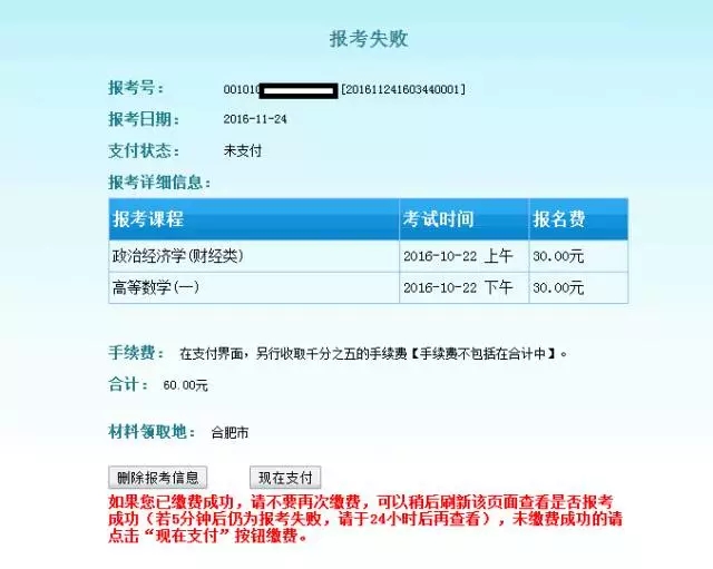 在“2019年10月考試報(bào)名”下面的“報(bào)考結(jié)果”查詢報(bào)名結(jié)果,如報(bào)考失敗,可以重新支付,也可以刪除原報(bào)考信息重新報(bào)考。